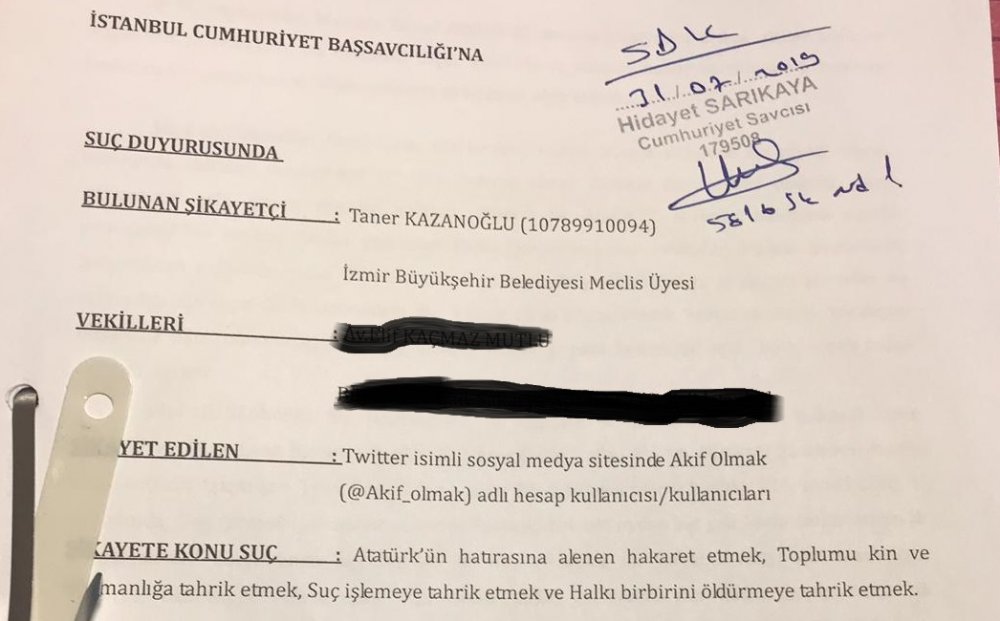 7 Kasım 2016’da Facebook hesabından “benzini boş verin dünyanın en pahalı cumhurbaşkanı bizde” şeklinde sosyal paylaşım sitesinde paylaştığı yazı için, Baykan Asliye isimli vatandaşın Ceza Mahkemesince 2 yıl 4 ay hapisle cezalandırıldığını siz sevgili basın mensubu arkadaşlarıma hatırlatırken, Âkif olmayı “Rabb'in önünde iki büklüm olup Küfrün karşısında dimdik durmak!” olarak değerlendiren sosyal paylaşım sitesi sahibi @Akif_olmak rumuzlu şahsı sizlerin tanıklığında ülkemiz kurucu Cumhurbaşkanı M. Kemal Atatürk’e ettiği küfür ve hakaretler nedeniyle ihbar ediyor, Cumhuriyet Savcılarımızı göreve davet ediyorum!
