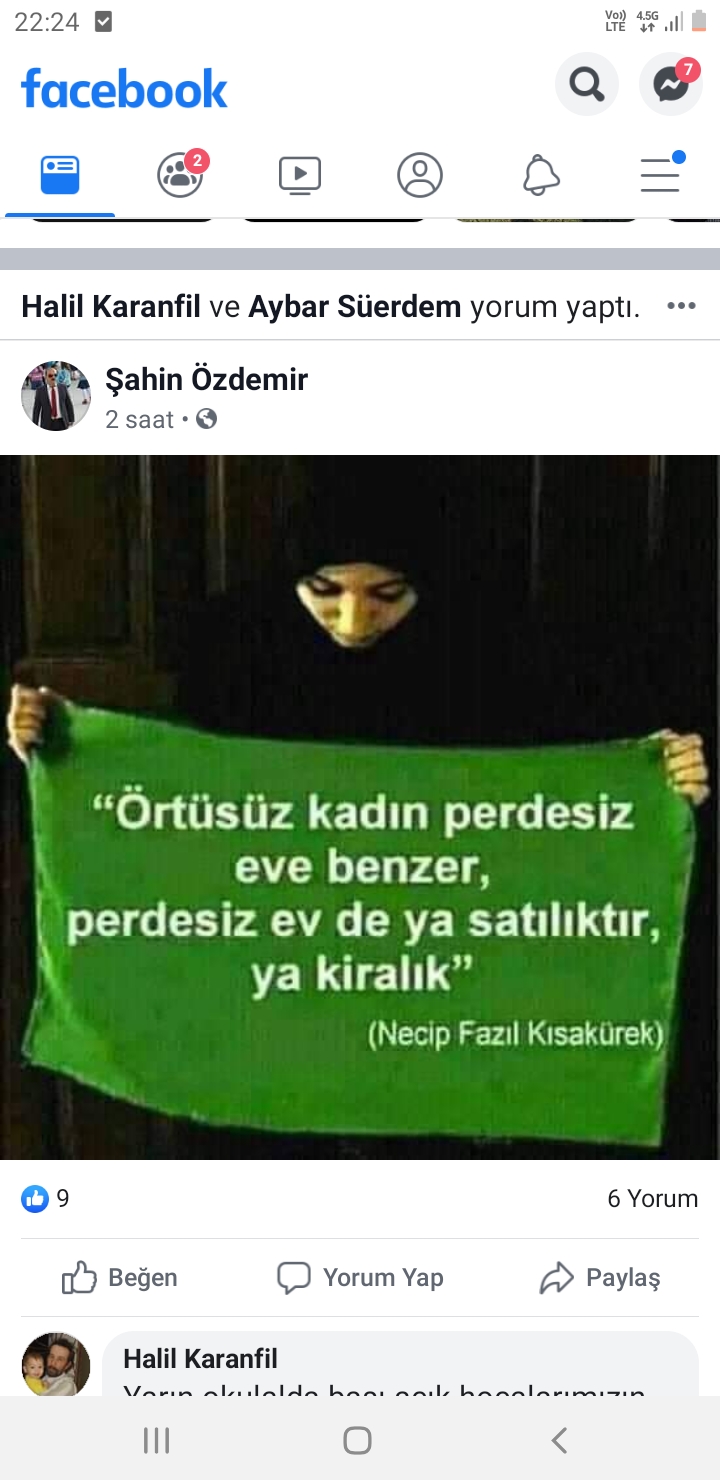 Bununla ilgili son olay Karaburun İlçesinde yaşanmış Karaburun İlkokul Müdürü Şahin Özdemir; sosyal medya hesabından “Örtüsüz kadın perdesiz eve benzer. Perdesiz ev ya satılıktır ya da kiralık” sözünü paylaşmıştır. İlkokul çağındaki çocukların kafasına bu tür düşünceleri sokarsanız ilerleyen yaşlarında bu çocukların kadınlara saygı göstermesini bekleyemezsiniz.
